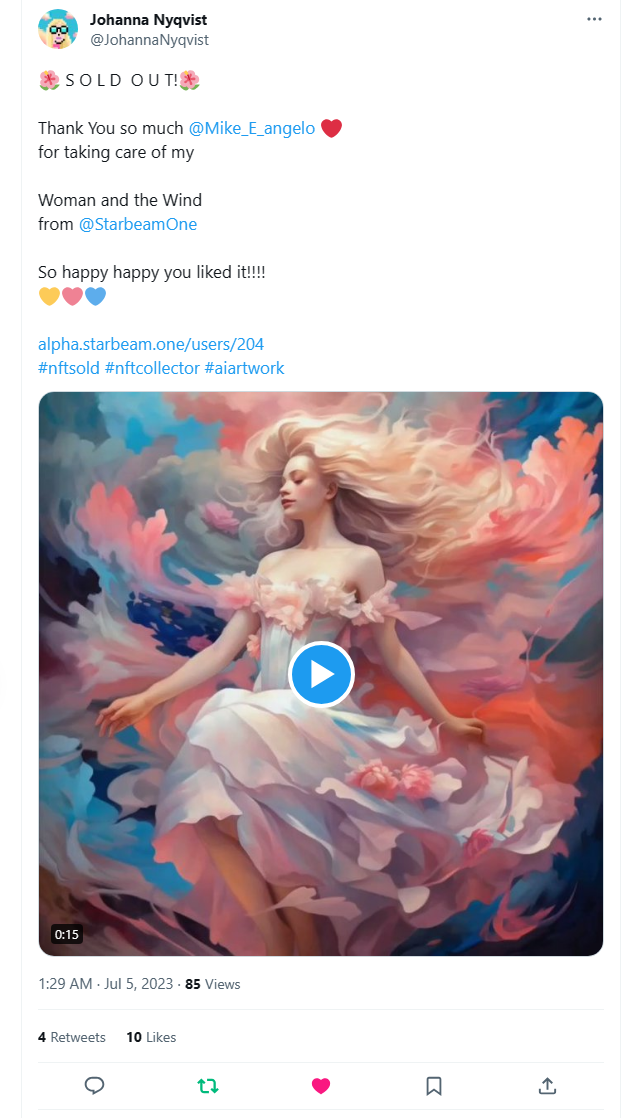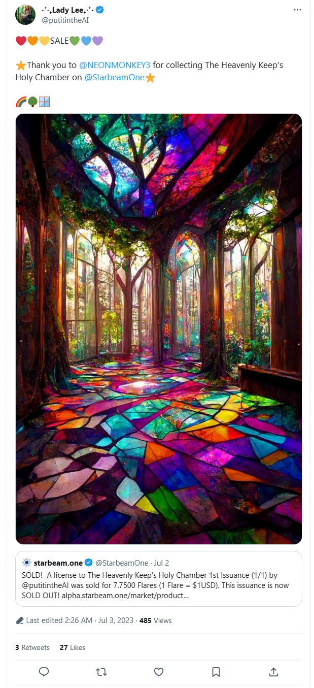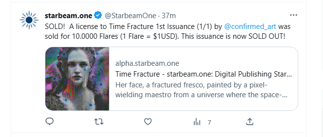 With automated postings, we have more content on our Twitter feed than other accounts with [tens of thousands of followers](https://twitter.com/seditionart).  Not only content but *engagement*.  Why?  With each new post, the Announcement Bot tags the creating artist and buyer if they exist on Twitter.  This is a very powerful dynamic and part of The Announcement Bot Legend that is currently underway.  [Here is an example](https://twitter.com/StarbeamOne/status/1676513611286495232):